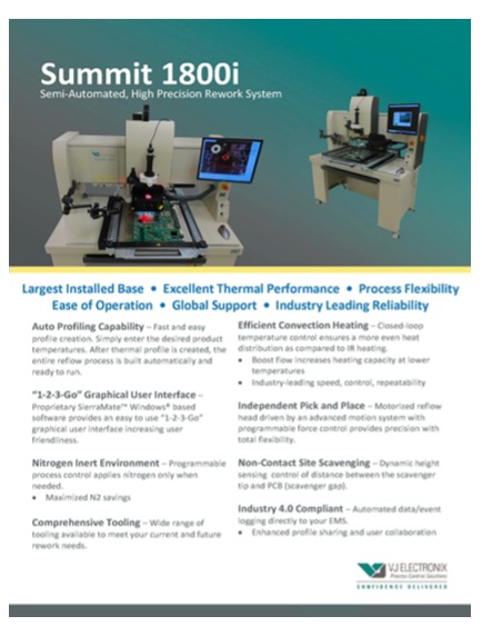 VJ拥有领先的高体积/高混合应用精密返修解决方案,是电子制造行业中安装较多的返修系统。该系统配备了易于使用的1-2-3-GO软件,操作简单直观。高效的对流加热提供高热通量、均匀性,并保证可重复的返工过程。自动非接触式站点清理功能安全地去除残留焊料,消除了对焊盘和焊接遮蔽层的潜在损害风险。专有软件提供产品可追溯性、工艺分析,并支持在VJE系统之间共享工艺文件。