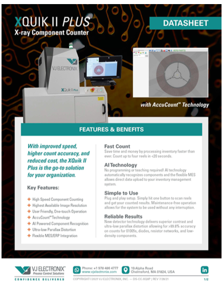 The XQuik II Plus is an improved version of the most installed component counter in the world today.The XQuik II Plus counts reels fast so you can process inventory sooner while saving money on labor and time. Count both a single reel or four reels in under 20 seconds. No programming or teaching is required. The system automatically recognizes components with AI