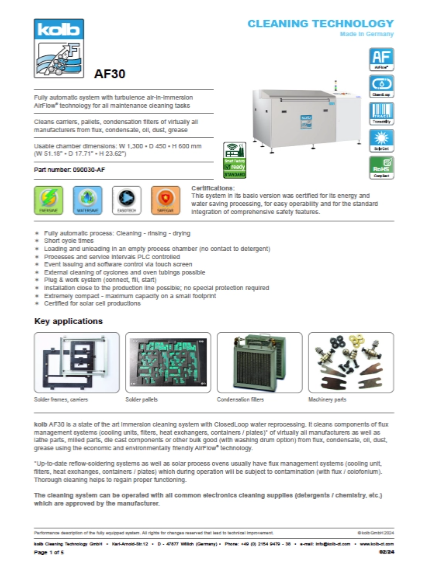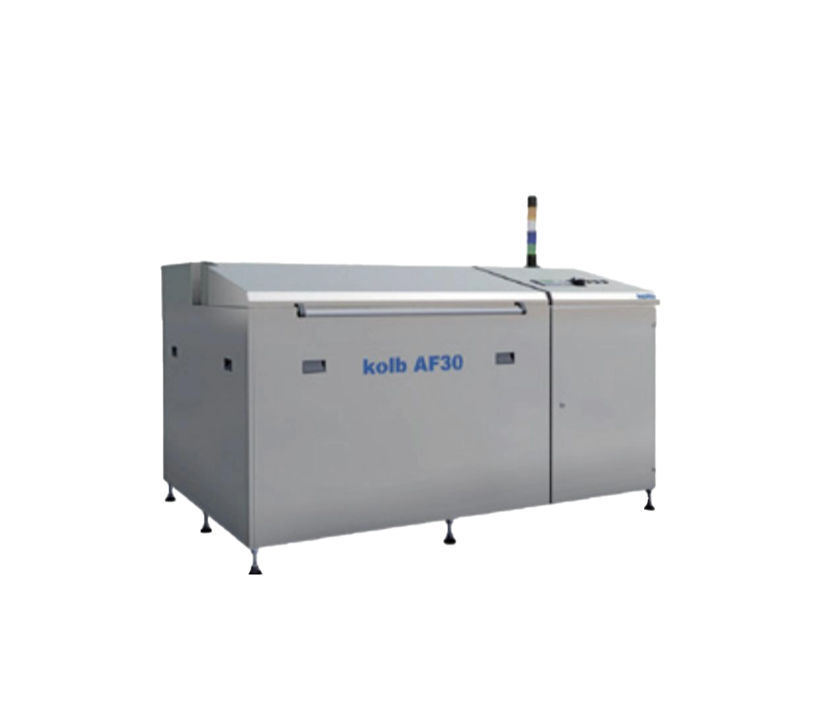 Kolb AF30 是一款最先进的单室 XL 系统,采用 AirFlow® 湍流气流浸泡技术和 ClosedLoop 水处理回收系统。它能够清洁几乎所有厂家生产的助焊剂管理系统的组件(如冷却单元、过滤器、热交换器、容器/板)以及车床零件、铣削零件或压铸部件上的助焊剂、冷凝物、油、灰尘和油脂,采用经济且环保的 AirFlow® 技术。